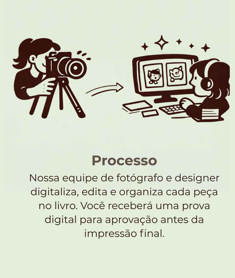 Aqui, transformamos pilhas de papéis em fotolivros que respiram carinho, página após página. Cada capa é fechada com o mesmo cuidado com que você guarda aquele primeiro desenho de família.